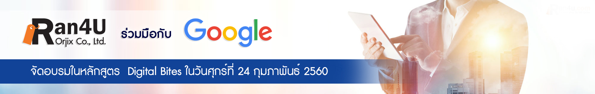การทำ Digital Marketing ให้ประสบความสำเร็จได้จริงนั้น บุคลากรในองค์กรจำเป็นจะต้องมีความรู้ความเข้าใจในหลักการของ Digital Marketing ดังนั้นเรา Ran4U ต้องการให้ธุรกิจที่เราดูแลทำเว็บไซต์ให้ ประสบความสำเร็จเกิดยอดขายเพิ่มขึ้นได้อย่างต่อเนื่อง เราจึงร่วมมือกับ Google ประเทศไทย จัดอบรมในหลักสูตร Digital Bites ให้กับทุกธุรกิจที่เราดูแลทำเว็บให้โดยไม่มีใช้จ่าย ( 1 บริษัทสามารถส่งตัวแทนเข้าอบรมได้ฟรี 2 ท่าน )