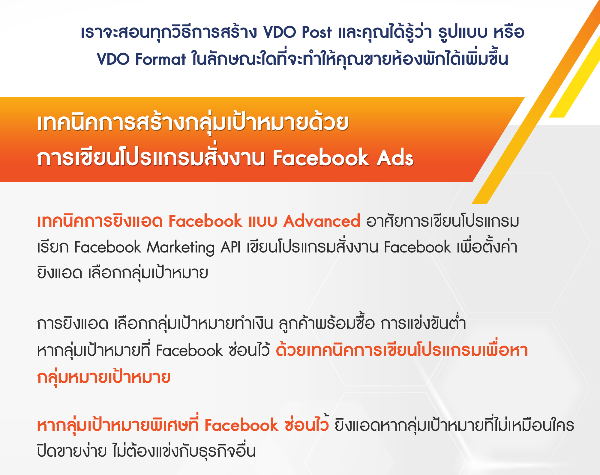 ไม่ใช้แค่สอนให้คุณตั้งโฆษณาเก่ง , ไม่ใช้แค่สอนให้คุณรู้ทุกเทคนิคในการกำหนดกลุ่มเป้าหมาย , ไม่ใช้แค่สอนให้คุณแค่อ่าน Report หรือดูค่าสถิติเป็นทุกค่า เพราะ ต่อให้คุณตั้งโฆษณาเก่งมาก หรือ รู้และเชี่ยวชาญในทุกเครื่องมือโฆษณาที่ Facebook มีให้ แต่ถ้าคุณไม่รู้วิธีที่จะนำ Facebook มาประยุกต์ใช้ในธุรกิจ "ให้เป็น" และ สามารถทำให้เกิด "ยอดขายได้แบบต่อเนื่อง" ก็ไม่มีประโยชน์